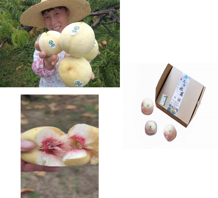 农场的桃类种植园,主要以冬桃为主。桃又名雪桃、贡桃, 肉质细腻, 甘甜多汁、清脆芳香、口感好, 营养较一般桃子高2~3倍, 含有丰富的蛋白质、果糖、果酸及多种维生素, 其中维生素C的含量是猕猴桃的3.4倍, 是苹果的6.3倍。果肉白色,由外向内逐渐变红,至近核处呈鲜红色,肉质硬脆,香甜,风味浓,半离核,果实极耐贮运。